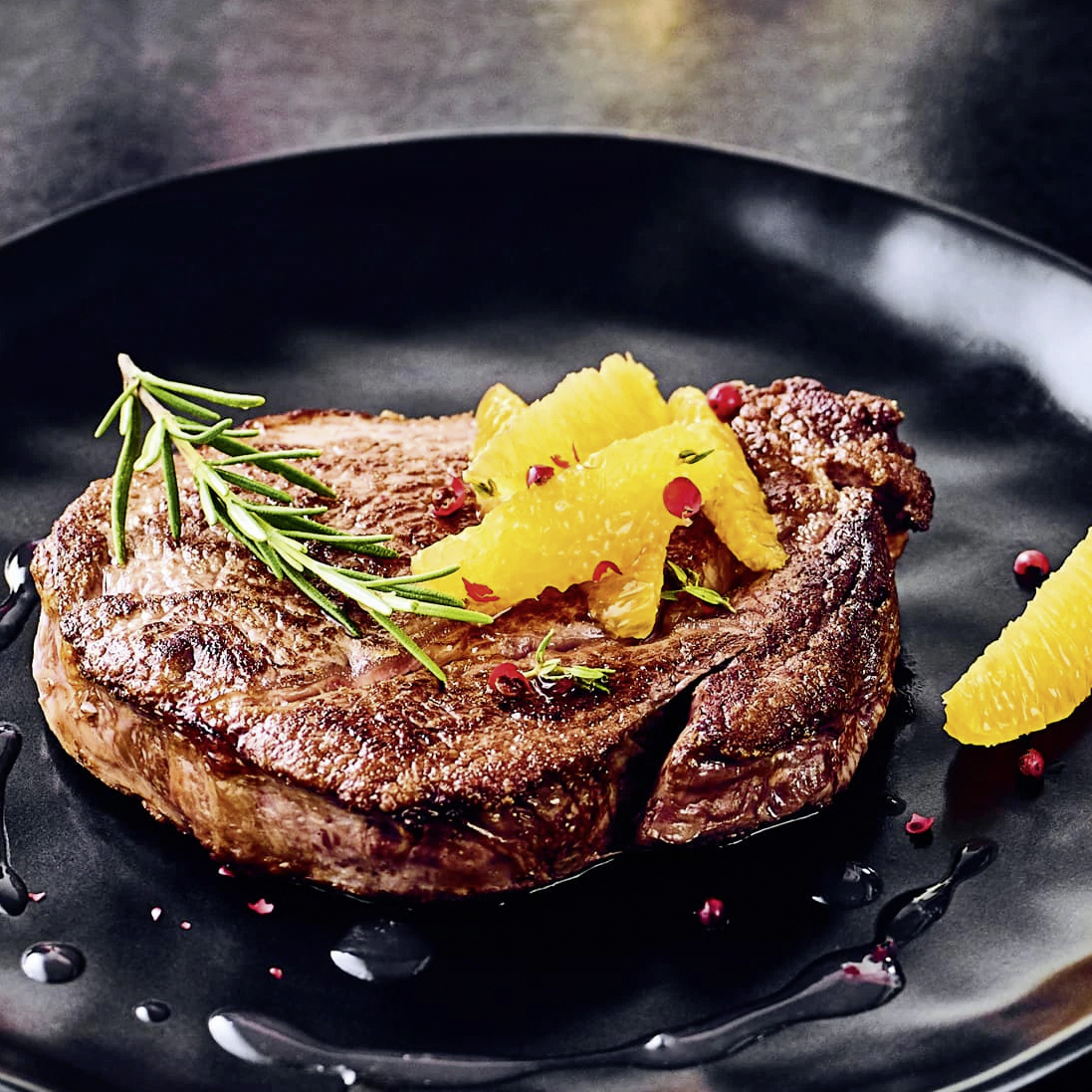 5. Entrecôte in vier gleich große Steaks portionieren und in einer beschichteten Pfanne unter Zugabe von Sonnenblumenöl von jeder Seite für 1 Minute scharf anbraten. Auf ein mit Backpapier ausgelegtes Backblech geben, je 1–2 Zweige Rosmarin drauflegen und für 10– 12 Minuten je nach Geschmack im Backofen garen.