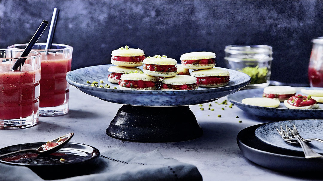 - Die Hälfte der Macaron-Schalen mit der flachen Seite nach oben bereit legen. Etwas Erdbeer-Füllung darauf geben und jeweils eine zweite Macaronschale auflegen. Sofort servieren und Shake dazu reichen.