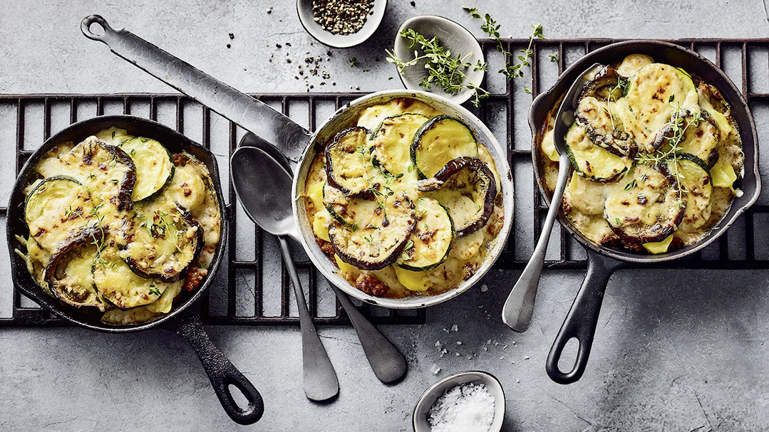 - Form mit je einer Lage Auberginen, Zucchini und Kartoffeln auslegen. Unter das Hackfleisch die Hälfte des Käses rühren und die Masse über den Gemüsescheiben verteilen.