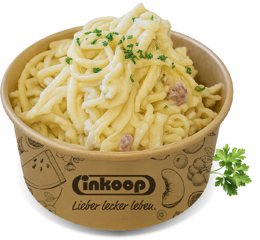 Unsere frisch zubereiteten Gerichte aus eigener Herstellung mit besten Zutaten. Zum Beispiel Linguine in herzhaft würziger Schinken-Sahnesoße.